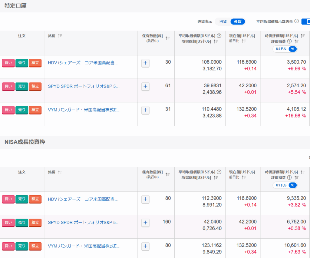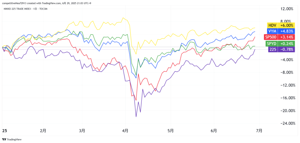 VYM, HDV, SPYDで比較するとHDVが好調で、全体的に安定感がありますね。