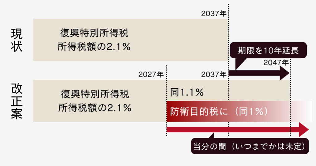 しかし、現行の復興財源確保のための復興特別所得税の税率を1%引き下げることで、家計負担にはならない形で実行されます。