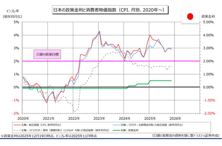 日銀は今年、1月と12月に計2回の利上げを行い、年初の0.25%から0.75%程度へ引き上げられました。政策金利は1995年以来の高水準となっており、10年物国債の利回りは2.0%を超えている状況です。