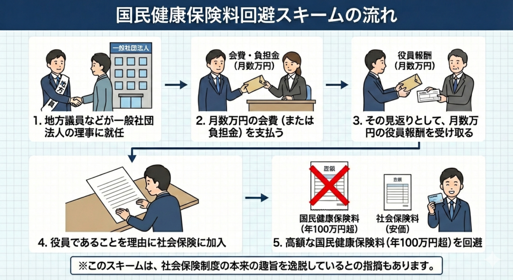 国民健康保険に本来加入すべき立場の議員が、一般社団法人の理事などの肩書を得て社会保険に入り、高額な国民健康保険料を回避していたのではないか、という点が問題視されました。